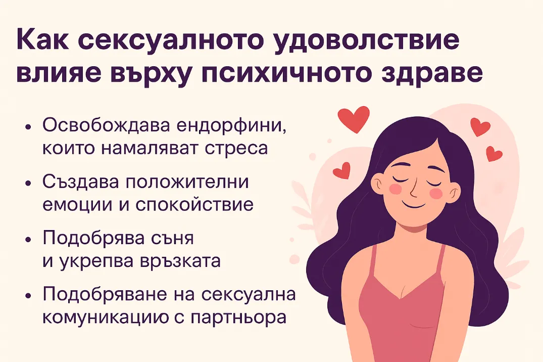 Сексуалното удоволствие може да действа като естествен антистрес механизъм. Оргазмът активира парасимпатиковата нервна система, която помага на тялото да се отпусне и намалява производството на кортизол – хормонът на стреса.